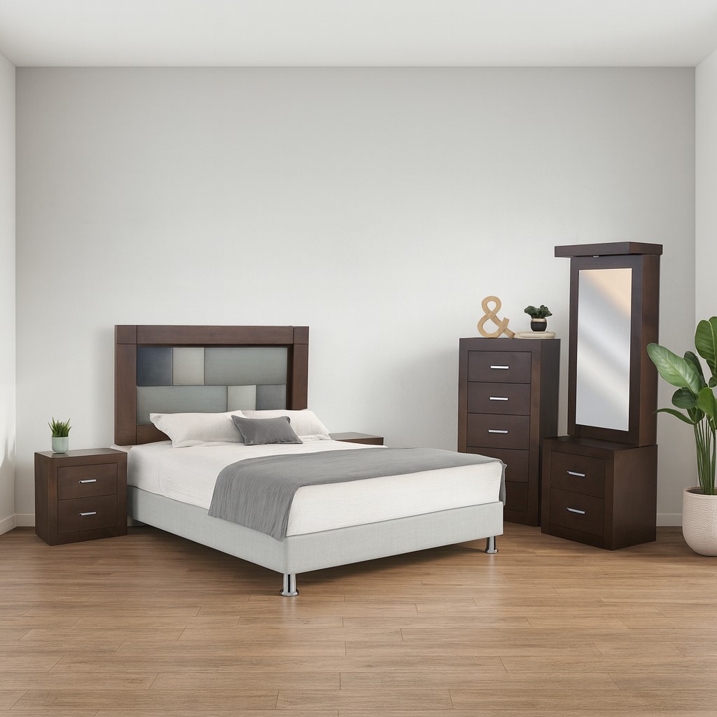 Transforma tu habitación en un refugio de estilo y confort con nuestra recámara completa que incluye un elegante tocador. Diseñada para brindar comodidad y un toque de sofisticación, esta recámara combina acabados modernos con funcionalidad práctica.